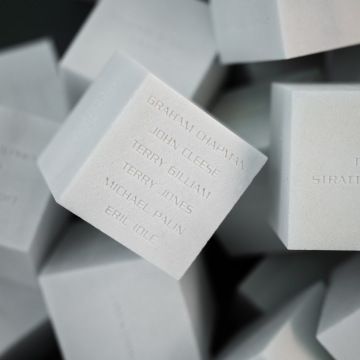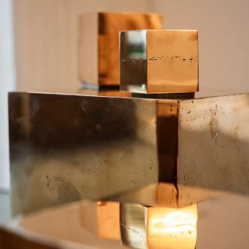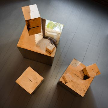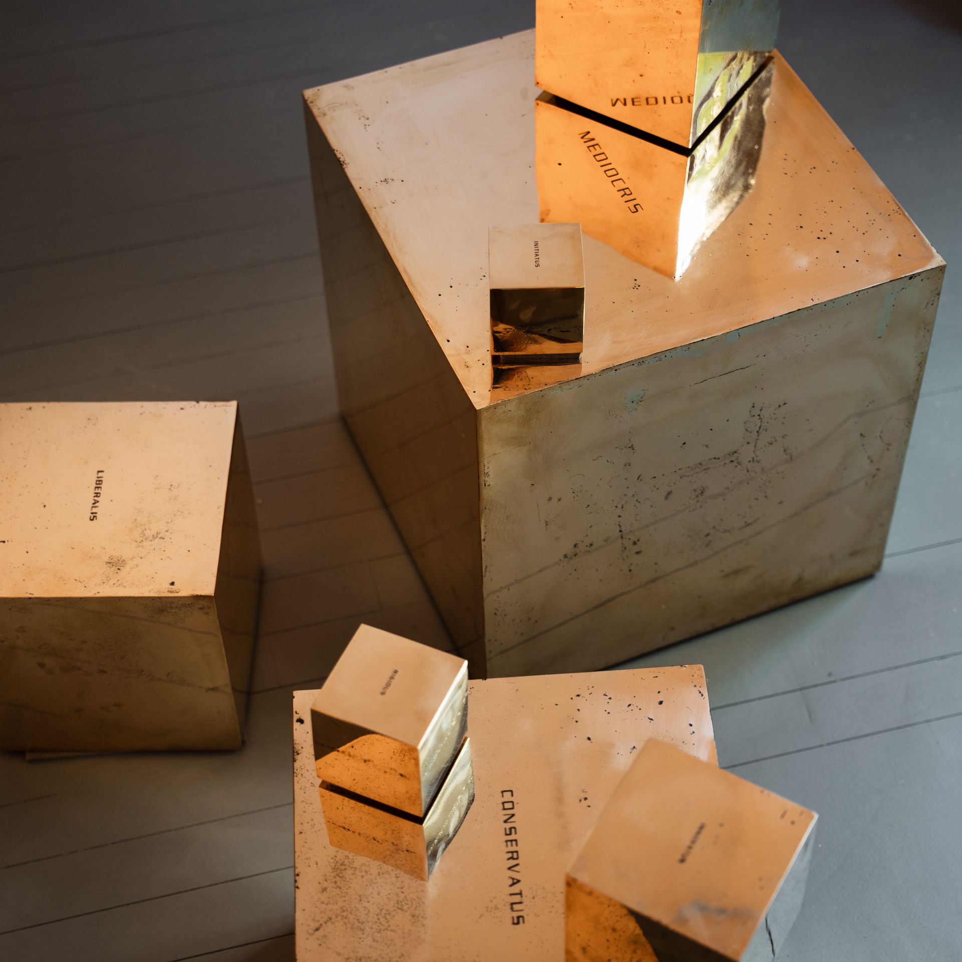 A study in human geometry, seven bronze cast polished cubes, hand engraved, 2025 1/4