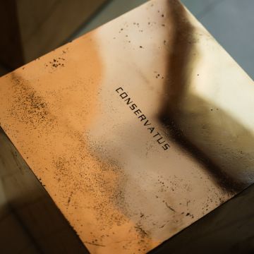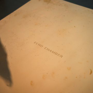 Cast in polished bronze, Echo Chamber is a sculptural reflection both literal and ideological. Its surface offers a seductive encounter with one's own image, to be interrupted by the quiet presence of an engraved phrase at its center: Echo Chamber. The term, borrowed from contemporary discourse on media and politics, refers to recursive loops of affirmation in which dissent is excluded and distortion amplified. The work operates as both platform and provocation. As the viewer confronts their own likeness in a surface, they are subtly positioned within the very system the piece critiques. What appears reflective becomes reflexive — an object that returns not just an image, but a question: What do we allow ourselves to hear, and with whom do we allow ourselves to interact and why do I facilitate confirmation bias?