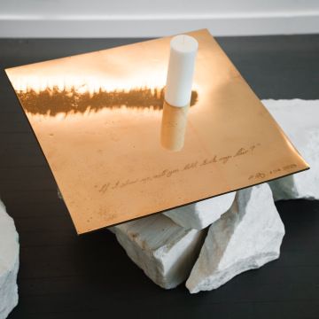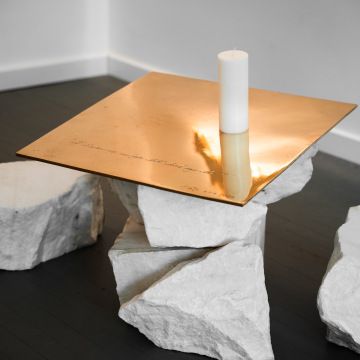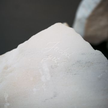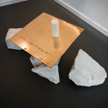 Date Night on the Rocks stages an unstable architecture of intimacy through a formal vocabulary that collapses sculpture, furniture, and relational aesthetics. Eschewing conventional legibility and support structures, the artist constructs two seating units and a table entirely from roughly hewn white marble boulders, each carefully balanced to form a composition that is as contingent as it is deliberate. The absence of traditional function foregrounds the work's preoccupation with emotional precarity and performative domesticity. The centerpiece, a 60 x 60 cm cast bronze tabletop, slightly tilted, introduces a material and symbolic counterpoint to the stone assemblage. Its polished surface invites both reflection and distortion, complicating the viewer's visual and conceptual engagement. The engraved phrase "If I throw up, will you hold back my hair?" operates as a fragment of conversational intimacy, hovering between abjection and care, irony and sincerity. A second inscription "Jaded Yet?" etched into one of the marble seats, signals emotional exhaustion within the iterative cycles of romantic exchange.