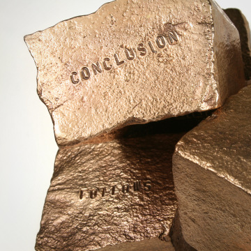 Futile represents a modular field of 6 polished bronze cast cobblestones, randomly arrangeable. Two bear the word conclusion, two bear the word follows, each engraved into the weighty surface. The work functions as both a sculptural text and a conceptual sequence, an inquiry into the instability of certainty and the temporality of judgment. By pairing the terms across an even distribution, the piece resists resolution. The viewer is drawn into the recursive logic where every conclusion is only a prologue to the next unfolding fragment. Cast in bronze, a material historically associated with permanence and commemoration, the transient nature of understanding is paradoxically enshrined, rendering the act of finality itself suspect. Futile speaks to the futility of arriving at absolute meaning in a world where context is in perpetual flux. It's a quiet monument to the epistemological hesitation, inviting the viewer to walk, pause, reconsider the presumed solidity of thought itself. Conclusion follows conclusion...