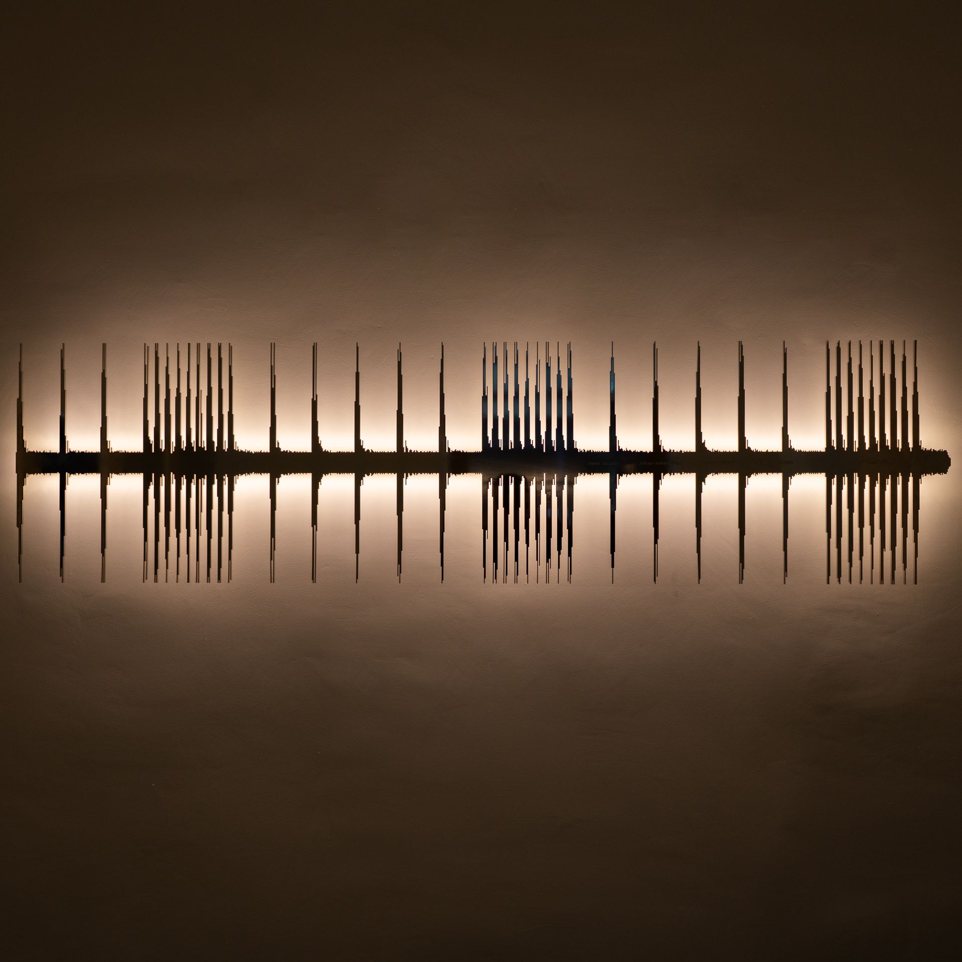 Wall instalation, watercut aluminum plate, engraved, nickel plated WAV-file visualization, 190 cm lenght x max 70 cm height, LED backlit, 2025 1/4